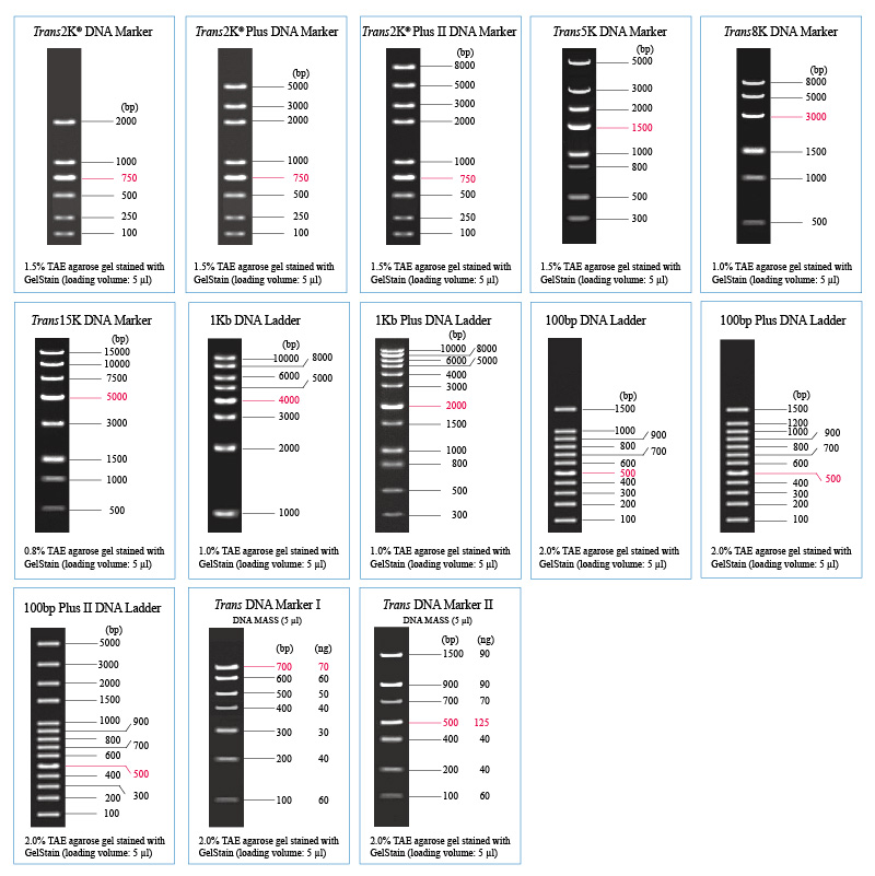 Trans DNA Marker 均采用國(guó)際先進(jìn)的生產(chǎn)工藝—酶切質(zhì)粒DNA,所得到的DNA Marker不僅背景干凈、帶型漂亮,且DNA分子量的準(zhǔn)確性、電泳帶型和產(chǎn)品的穩(wěn)定性遠(yuǎn)遠(yuǎn)高于PCR產(chǎn)物混合而成的DNA Marker。所有DNA Marker系列產(chǎn)品均為即用型產(chǎn)品,已含有適宜濃度的上樣緩沖液,可直接電泳,使用方便。4℃保存六個(gè)月,-20℃保存兩年。不建議用于聚丙烯酰胺凝膠電泳。
