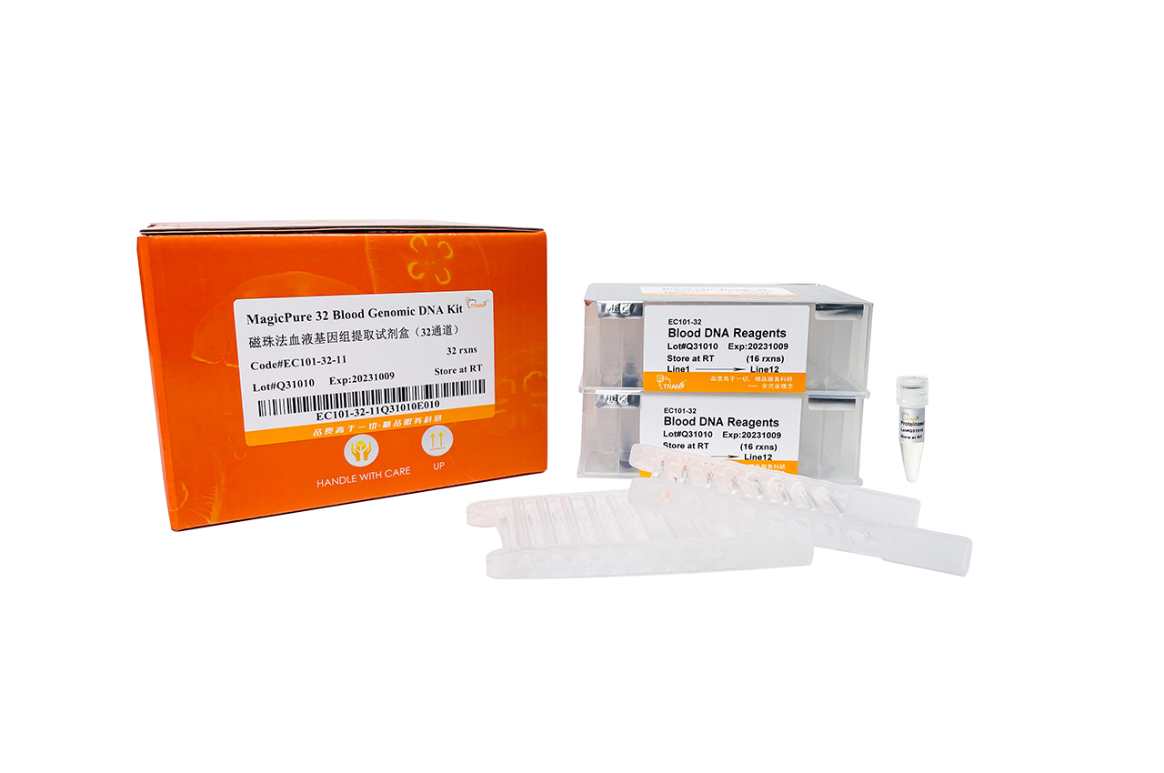 本試劑盒采用酶解法裂解血液,利用硅基磁珠特異地吸附DNA,硅基磁珠在緩沖體系中對(duì)目的DNA具有很強(qiáng)的磁吸附力,當(dāng)離子強(qiáng)度發(fā)生改變時(shí),磁珠釋放吸附的DNA從而達(dá)到快速分離純化DNA的目的。本試劑盒適用于從50-250 μl新鮮、冷凍或加入抗凝劑血液中高效地提取基因組DNA。所得產(chǎn)物純度高,適用于酶切、PCR、qPCR和Southern Blot等實(shí)驗(yàn)。本試劑盒適用于32通道磁棒式自動(dòng)化核酸提取儀。