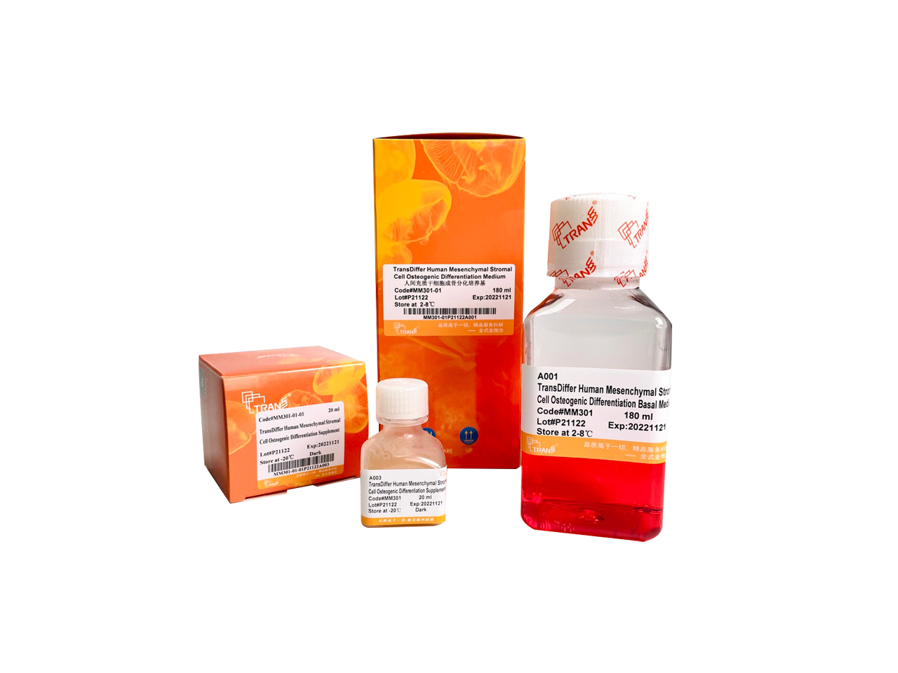 TransDiffer? Human Mesenchymal Stromal Cell Osteogenic Differentiation Medium是一種含血清的完全培養(yǎng)基,適用于將人間充質干細胞(Human Mesenchymal Stromal Cells, MSCs)向成骨細胞分化。本試劑盒普適性強,適用于多種培養(yǎng)體系(含血清及無血清)培養(yǎng)的不同來源(人多能性干細胞衍生、骨髓、臍帶、脂肪來源)的MSCs。本產品穩(wěn)定性好,配制好的完全培養(yǎng)基可于2-8℃穩(wěn)定保存1個月。本產品分化效率高,可用于間充質干細胞多向分化潛能鑒定中成骨分化的鑒定。