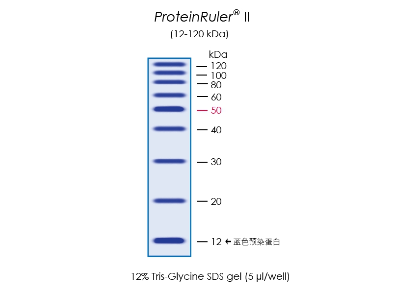 ProteinRuler? II由9種重組蛋白質組成,分子量范圍為12 kDa-120 kDa。經(jīng)SDS-PAGE電泳后,用考馬斯亮藍染色可見清晰的9條帶。12 kDa為藍色預染蛋白,便于動態(tài)觀察蛋白質電泳狀態(tài)。50 kDa為加亮條帶,便于分子量鑒定。