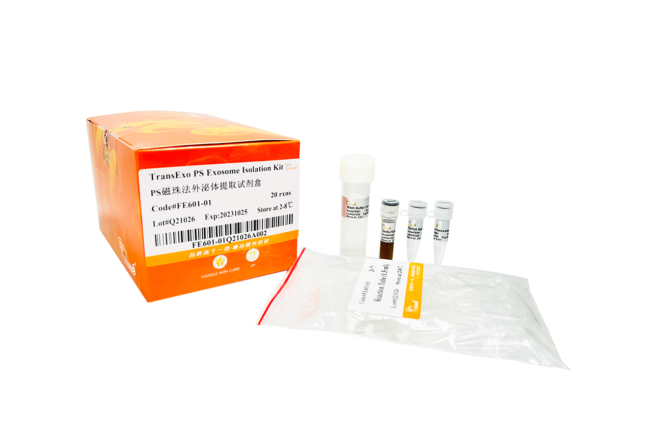 TransExo? PS Exosome Isolation Kit以磁珠為核心原料,通過磷酯酰絲氨酸(Phosphatidylserine,PS)親和受體蛋白的作用,特異性捕獲血清、肝素血漿、尿液、細(xì)胞培養(yǎng)上清等多種樣本中的外泌體。隨后在溫和的條件下,用中性洗脫溶液將外泌體從磁珠上洗脫下來,獲得形態(tài)良好、結(jié)構(gòu)完整的高純度外泌體。提取的外泌體適用于Western Blot、qPCR、電鏡、納米粒子追蹤等多種檢測,同時可用于細(xì)胞共培養(yǎng)。